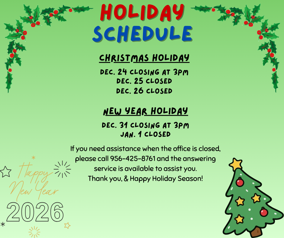 Mon 8am - 5:45pm Tue - Friday: 8:00am - 5:00pm Saturday & Sunday: CLOSED Reach us after office hours: (956) 425-8761
